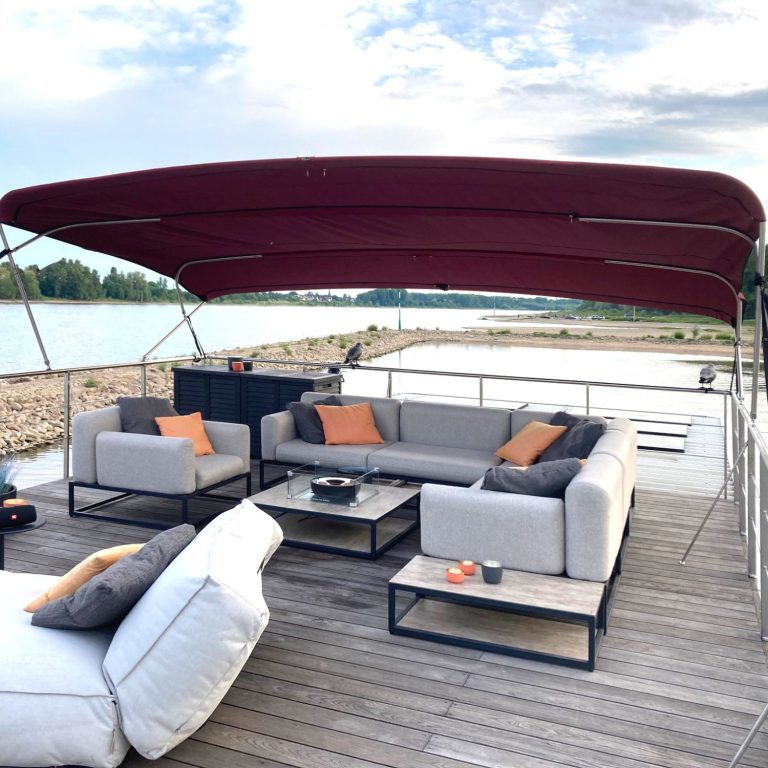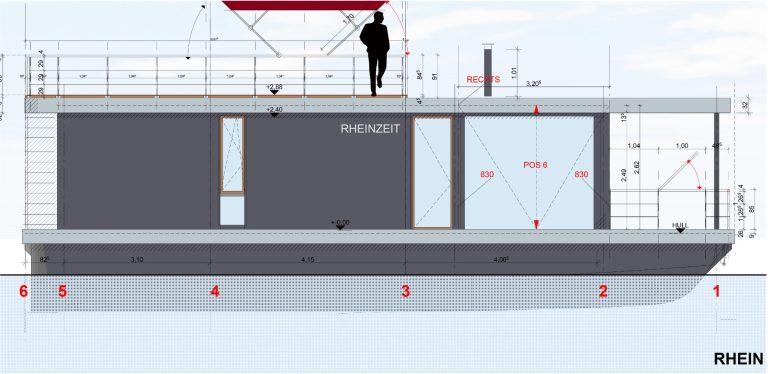Nach Festlegung des geeigneten Liegeplatzes in der Marina Köln Sürth wurde das Boot so entworfen, dass es einen ungestörten Blick auf den Rhein bietet. Die Maximierung des Ausblicks aus sämtlichen Räumen hatte höchste Priorität. Eine bedeutende Herausforderung bestand darin, ein großzügiges Raumkonzept innerhalb der zulässigen maximalen Länge von 15 m für Sportboote zu realisieren. Hieraus entwickelte sich ein lichtdurchflutetes, voll ausgestattetes Appartement mit einer Grundfläche von 52 m², einem überdachten Freisitz von ca. 12 m² und einem weitläufigen Sonnendeck von etwa 35 m².